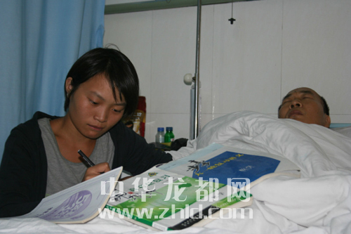 韓金霞趁父親睡時在病房學(xué)習(xí)