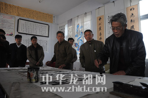 ????作為距離太康縣城最遠(yuǎn)的一個(gè)邊界鄉(xiāng)鎮(zhèn),轉(zhuǎn)樓鄉(xiāng)的文化活動(dòng)開展得有聲有色。該鄉(xiāng)依托文化站,成立了在鄉(xiāng)一級(jí)少見的文聯(lián),下設(shè)書法家協(xié)會(huì)、腰鼓協(xié)會(huì)、嗩吶協(xié)會(huì)等。我們?cè)谵D(zhuǎn)樓鄉(xiāng)政府采訪時(shí),正碰上書法家協(xié)會(huì)20多名會(huì)員在一起切磋書藝。今年74歲的許家榮是鄉(xiāng)書法家協(xié)會(huì)主席,也是《周口晚報(bào)》的老讀者,看到我們到來(lái),老人興之所至,當(dāng)場(chǎng)揮毫潑墨,為本報(bào)題寫了“周口邊界行接地氣有人氣”的條幅。據(jù)了解,每逢春節(jié),書法家協(xié)會(huì)會(huì)員都會(huì)走村串戶,為村民義務(wù)書寫春聯(lián)。