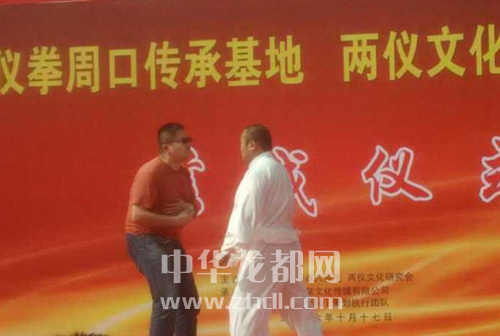 ????當(dāng)日,在兩儀拳周口傳承基地揭牌和兩儀文化周口發(fā)展中心落成儀式上,兩儀拳傳承人分別做了兩儀拳展示和兩儀養(yǎng)生功夫表演。隨后,段保華的弟子高躍鑫請(qǐng)現(xiàn)場(chǎng)觀眾上臺(tái)體驗(yàn)兩儀拳點(diǎn)穴。一位身材高大、體重近100公斤的彪形大漢應(yīng)聲上臺(tái)。彪形大漢與高躍鑫交流后,表示已準(zhǔn)備完畢。話(huà)音剛落,彪形大漢就被點(diǎn)中穴道,立即倒地。讓人驚奇的是,解穴后,彪形大漢隨即恢復(fù)正常。“以前聽(tīng)說(shuō)過(guò)兩儀拳的威力很大,沒(méi)想到會(huì)這么大。”彪形大漢說(shuō)。