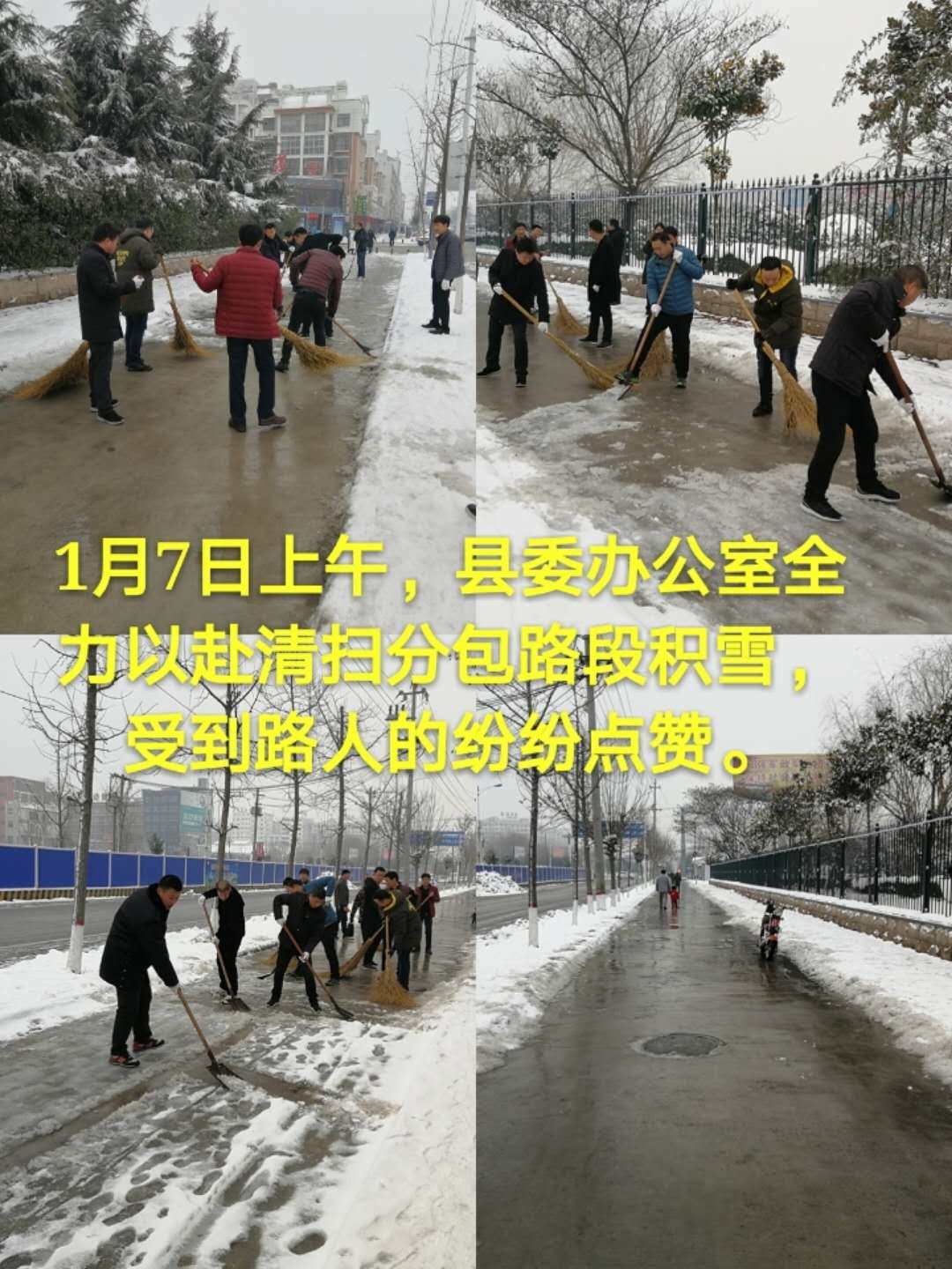一呼百應。該縣縣直各單位、新城、洺南、洺北辦事處,城郊鄉(xiāng)、工業(yè)區(qū)接到通知后,立組織機關企事業(yè)單位干部職工上街掃雪、鏟雪,做到本單位出入口、文明城創(chuàng)建責任區(qū)路面基本無積冰、殘雪。各辦事處發(fā)揮屬地管理作用,重點發(fā)動新華路、迎賓大道、世紀大道、人民路、育新路、文化路、交通路、科技大道等沿街單位及商戶主動落實“門前三包”,清掃人行道積雪。城管部門從1月5日開始一直未停歇,前兩天雖然雪花飄舞,他們冒雪出動大型車輛、組織專業(yè)隊伍,最大程度的保障了主次干道無積雪、通行順暢。今日,縣城管局按照縣委、縣政府的指示精神,正夜以繼日加大城區(qū)主路行車道路面的清掃力度。在清掃的同時,出動各種運輸車輛,協(xié)助各單位及時把中心城區(qū)冰雪清運、規(guī)范堆放,確保行人和車輛正常安全通行。