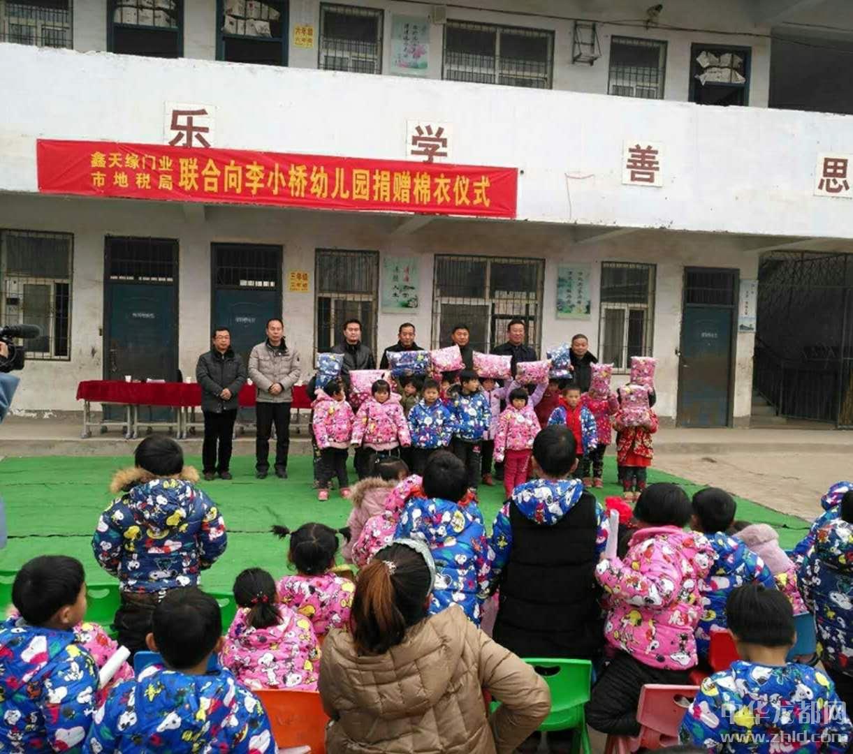 中華龍都網(wǎng)訊(周口報業(yè)全媒體記者 馬治衛(wèi) 通訊員 蘇童)一件衣物一份溫暖,一顆愛心一份感動。1月22日下午,市地稅局駐村工作隊聯(lián)合愛心企業(yè)鑫天緣門業(yè)開展了向太康縣王集鄉(xiāng)李小橋幼兒園“送溫暖、獻愛心”棉衣捐贈活動,為100多名孩子送去了價值5100元的御寒冬衣。市地稅局、太康縣教體局、王集鄉(xiāng)黨委政府有關(guān)負責同志及部分學生家長和全校師生共400余人參加了此次捐贈儀式。