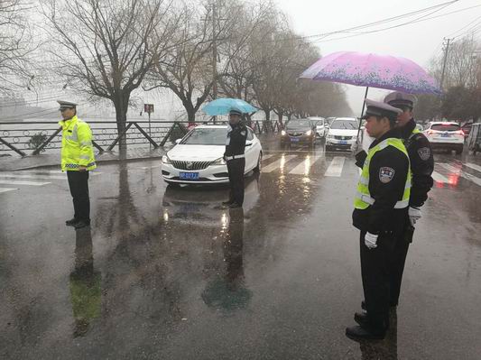 按照會議的統(tǒng)一安排部署,交警大隊城市中隊負(fù)責(zé)羲皇賓館門前、老看守所路口和商城東路的道路保障工作。執(zhí)勤民警合理分配警力,清理引導(dǎo)路面亂停亂放車輛,合理分流駛?cè)胲囕v,規(guī)范指揮路口交通,他們克服寒冷下雨惡劣天氣,充分發(fā)揚不怕苦不怕累的精神。在雨中一刻不停的忙碌著,中隊長閆本志的微信運動的步數(shù)達(dá)到30000多步,成功登頂榜首,交警隊員李炯等帽子淋濕了,衣服淋濕了,鞋子也進(jìn)水了,他們顧不了這些,一絲不茍的工作。他們的辛苦付出感動了過往司機和行人,一位女士下車送來雨傘,被執(zhí)勤交警婉拒了,后邊的過路行人直接打開車窗為過交警扔下雨傘而去。一會功夫,執(zhí)勤的路口多了各種色彩的花雨傘,在雨中游走,像綻放的太陽花,裝扮了雨中的淮陽。