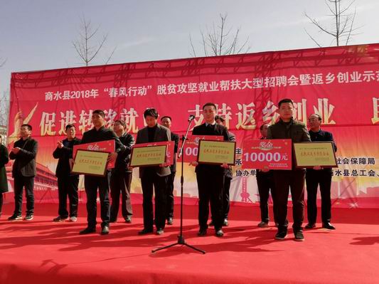 會(huì)上,縣委、縣政府授予商水縣紫金置業(yè)、周口正念創(chuàng)業(yè)孵化器、河南省元來農(nóng)業(yè)科技、商水縣萬和園花卉種植合作社等公司“返鄉(xiāng)農(nóng)民工示范企業(yè)”榮譽(yù)稱號,授予王鵬飛、李紅雷、蘇桂州、宋銀花、劉天華、張金波、任聯(lián)軍、葉天力、羅國昌、劉書顯等“返鄉(xiāng)創(chuàng)業(yè)標(biāo)兵”榮譽(yù)稱號。