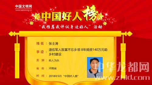中華龍都網(wǎng)訊(周口報業(yè)全媒體記者 馬治衛(wèi))5月30日,中央文明辦、中國文明網(wǎng)正式發(fā)布了2018年“中國好人榜”5月榜單。我市太康籍張士濤榮登5月份“中國好人榜”。