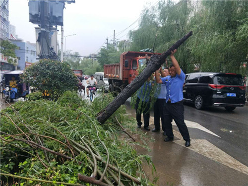 在S102西沙河大橋北,暴風雨刮倒路樹。川匯區(qū)公路局接報后,立即組織養(yǎng)護搶險人員冒雨用手和工具清理倒伏路樹。下午2時,經(jīng)過兩個小時的緊張工作,相關(guān)路段恢復正常通車。