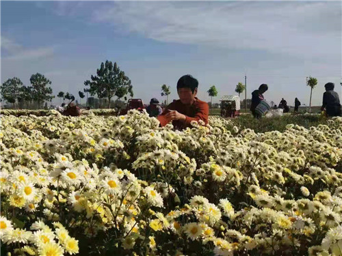 當日,位于高集鄉(xiāng)北部的黨橋、雙堂等幾個行政村,也是熱鬧非凡。一臺臺大小不同的車輛,滿載著剛從地里摘下的鮮菊花,正往富甲一方菊花加工廠里銷售,縷縷的菊花清香隨風飄來,煞是誘人。在富甲一方合作社帶動下,今年有16戶貧困戶種植80多畝菊花,鄉(xiāng)政府對首次種植的貧困戶負責技術(shù)培訓,并給予每畝1000元的生產(chǎn)獎補。今年菊花每公斤4元左右,麥茬種植菊花每畝可產(chǎn)鮮菊1100-1300公斤,去掉雇人摘菊花費用每公斤0.3元,每畝可收入4000-5000元。種植菊花的貧困戶孫建國在富甲一方收購現(xiàn)場,正樂呵呵的數(shù)著賣菊花得來的大把鈔票。