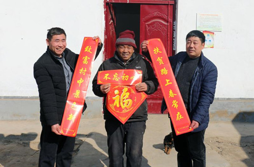 1月24日,扶溝縣白潭鎮(zhèn)王村貧困戶王奎鎖喜滋滋地從縣財(cái)政局扶貧工作人員手中接過對聯(lián)。為營造歡樂祥和、文明有序的節(jié)日氛圍,宣傳扶貧政策,扶溝縣財(cái)政局對所幫扶7個(gè)行政村開展“情暖萬家·迎新春送春聯(lián)”助力脫貧攻堅(jiān)活動,以此傳達(dá)黨的十九大精神和脫貧攻堅(jiān)精神。