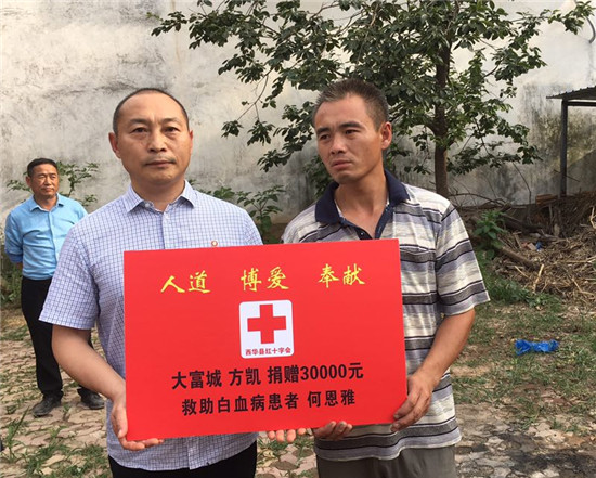 一次偶然的機(jī)會(huì),“感動(dòng)周口十大人物”、“周口市十大慈善人物”方凱得知何恩雅的情況后,便想前往她的家里,了解病情,慷慨解囊。這位周口凱盛實(shí)業(yè)的董事長(zhǎng),素以慈善為懷,10多年來(lái)拿出800多萬(wàn)元,堅(jiān)持幫助困難群眾。