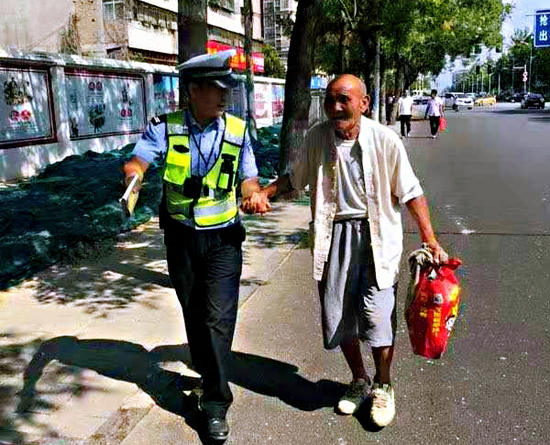 畢鵬發(fā)現(xiàn)這一情況后,立即上前攙扶老人,路過的車輛看到這一幕也紛紛停車讓行。在安全通過馬路后,老人告訴畢鵬,他找不到公交車站,無法回家。隨后,畢鵬手挽手將老人送到公交車站(如圖)。待老人安全坐上公交車后,畢鵬才回到工作崗位上。