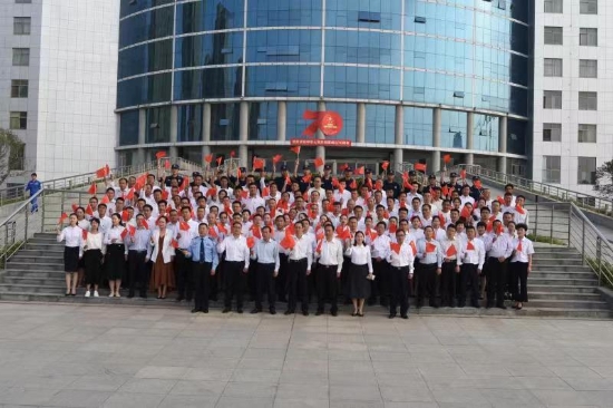 我和我的祖國一刻也不能分割,無論我走到哪里都留下一首贊歌,我歌唱每一座高山,我歌唱每一條河……嘹亮的歌聲在開發(fā)區(qū)辦公樓前的小廣場(chǎng)久久回蕩。