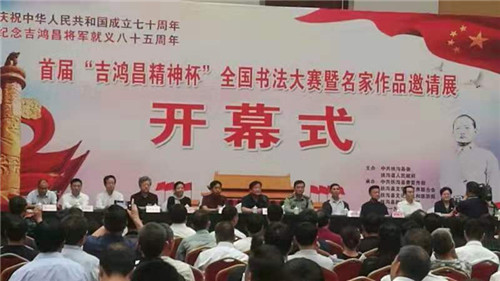 為紀(jì)念抗日民族英雄吉鴻昌將軍就義85周年,大力弘揚(yáng)愛(ài)國(guó)主義精神和中華民族優(yōu)秀傳統(tǒng)文化,9月28日上午,首屆“吉鴻昌精神杯”全國(guó)書(shū)法大賽暨名家作品邀請(qǐng)展在扶溝縣體育館隆重舉行。原廣州軍區(qū)政治部副主任陳大民少將、解放軍報(bào)社原副社長(zhǎng)田仁德少將、解放軍報(bào)社原副總編孫臨平少將、解放軍裝備學(xué)院原副政委孫南京少將、解放軍總后勤部某研究所原所長(zhǎng)楊廷欣少將、吉鴻昌將軍親屬鄭吉安大校,市委常委、周口軍分區(qū)政委孫先振,市政協(xié)副主席張文平,扶溝縣四個(gè)班子領(lǐng)導(dǎo)及副處級(jí)干部等出席開(kāi)幕式??h委副書(shū)記、政法委書(shū)記詹凱主持儀式。