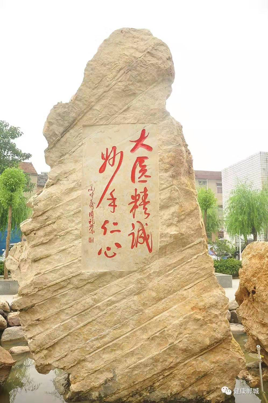 他雖然離開了鄲城,但一直關(guān)注著醫(yī)院的發(fā)展。醫(yī)院領(lǐng)導(dǎo)也多次到上??赐蛩麉R報(bào)醫(yī)院近年來的發(fā)展情況。2016年,鄲城縣人民醫(yī)院院長(zhǎng)于健到上??赐?,聽到醫(yī)院近年來快速健康的發(fā)展進(jìn)程,周老先生非常高興,欣然提筆寫下“大醫(yī)精誠,妙手仁心”八個(gè)大字。周老先生的題詞被雕刻在一尊文化石上,座落在醫(yī)院文化廣場(chǎng)上。