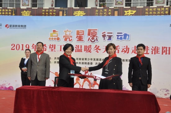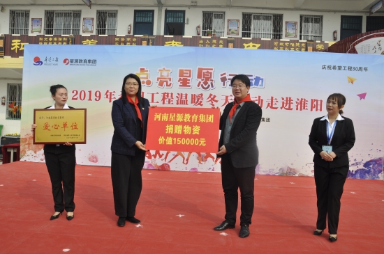 11月8日,由共青團河南省委、河南省青少年發(fā)展基金會、河南星源教育集團主辦,共青團周口市委、中共淮陽縣委、共青團淮陽縣委承辦的慶祝希望工程30周年“點亮星愿行動”2019年希望工程溫暖冬天活動走進淮陽在淮陽縣城關(guān)鎮(zhèn)北關(guān)學(xué)校隆重舉行。