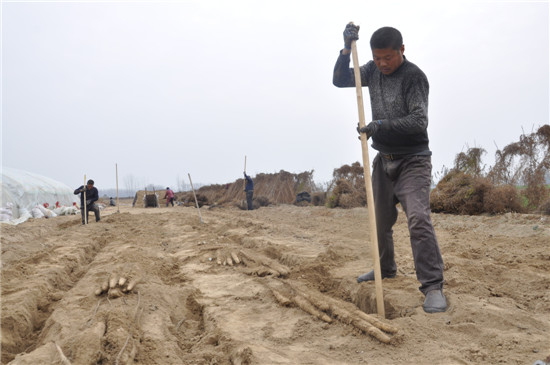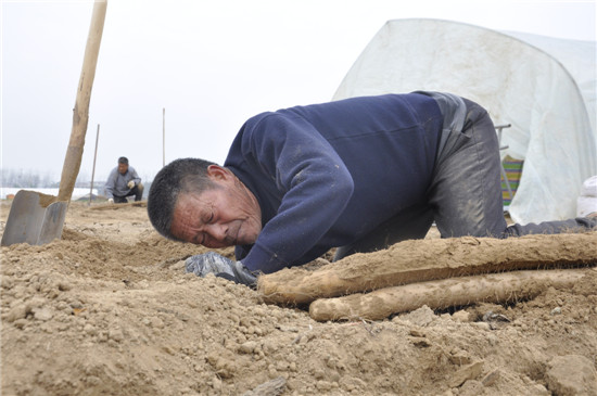 11月26日,沈丘縣白集鎮(zhèn)40多歲的耿金中與另外兩個(gè)同伴一起來(lái)到周口城鄉(xiāng)一體化示范區(qū)許灣鄉(xiāng)肖王莊,未來(lái)的一段時(shí)間,他們吃住都將在這里進(jìn)行,直到將這一區(qū)域的山藥挖完。耿金中說(shuō),他挖山藥已經(jīng)有20多年了,20多年前,沈丘縣大規(guī)模種植山藥,每到收獲時(shí),會(huì)有很多山東挖山藥工人來(lái)這里挖山藥。他看到這個(gè)行當(dāng)能賺錢,就開(kāi)始學(xué)挖山藥技術(shù)。此后的多年,他先后到山西、湖北、安徽等地挖山藥。