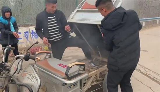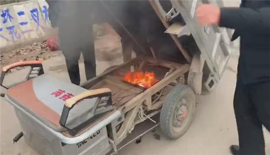 “當(dāng)時(shí)在我們前方的一輛電動(dòng)三輪車駕駛座下冒出黑煙,車上兩位老人察覺到危險(xiǎn)后,急忙下車,站在一旁不知所措。我們也緊跟上前。事發(fā)突然,現(xiàn)場沒有滅火器和可利用水源,而三輪車的火越來越大,兩位老人著急萬分,在旁邊不停地請(qǐng)求我們幫幫她們。根據(jù)經(jīng)驗(yàn),我們當(dāng)機(jī)立斷利用路邊的泥土進(jìn)行撲救,經(jīng)過幾十秒的緊張撲救,著火部位被成功撲滅?!比幌狸?duì)員回憶說三輪車是電線短路引起的電瓶著火。