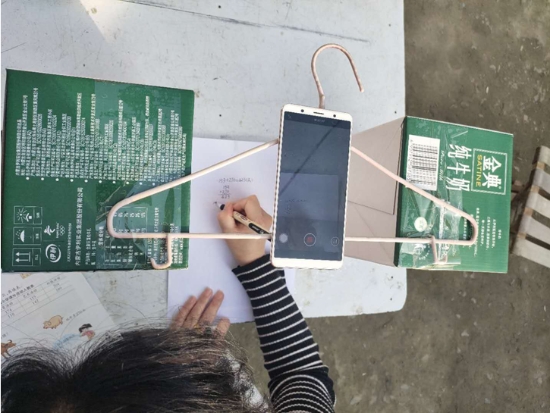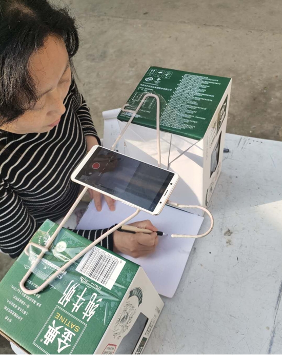 在備課時,朱霞很快遇到了難題:手機沒法固定,街上手機店又全部停業(yè),網(wǎng)上買的手機固定夾發(fā)不了貨。為了不耽誤學生上課,她想到用晾衣?lián)?、牛奶箱做成簡易支架,組裝后居然效果不錯。就這樣,一個晾衣?lián)?、兩個牛奶箱和一部手機組成了她的“三尺講臺”。