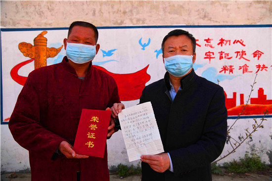 “疫情風(fēng)聲鶴唳,村里還有10家從武漢回村過年的村民,大年初一,上面要求封村了,鄉(xiāng)親們還是亂跑,到河邊扎堆釣魚,攆不散”,王志成說,他心急如焚,深知疫情嚴(yán)重,在這種情況下,一家人感染,一個(gè)村子的人咋辦?,一定得有人管。他在街上碰見十一組村民、退伍兵王明甫,兩人想法相合,隨即決定,成為自愿抗疫小分隊(duì),自己籌備物質(zhì),開展動員村民居家抗疫、幫助困難村民、對村里實(shí)施消毒等抗疫事宜。王明甫向縣農(nóng)發(fā)行駐村第一書記王長海匯報(bào)后,得到大力支持。