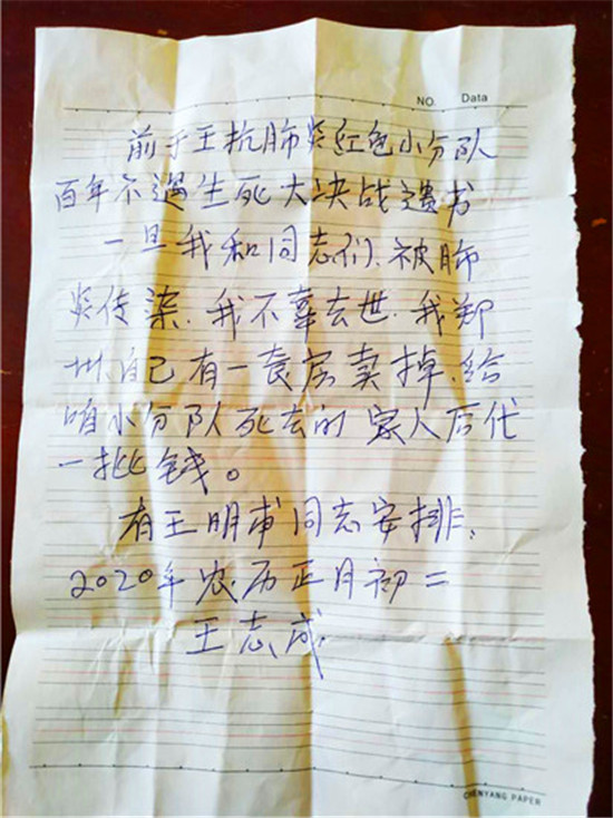 初二晚上,他是邊哭邊寫下遺書。他說,病毒傳染,看不見摸不著,也不知道誰攜帶?更不知道明天大家是個(gè)什么情況,既然動員大家沖到抗疫一線,戰(zhàn)死了,他的家人咋辦?他說,他在鄭州有一處房產(chǎn)是養(yǎng)老用的,他害怕自己不幸感染去世了,沒人照顧小分隊(duì)?wèi)?zhàn)死的家人生活,隨寫下遺書,如果出現(xiàn)這種情況,將他的房產(chǎn)賣掉,分給抗疫戰(zhàn)死的隊(duì)員家人。