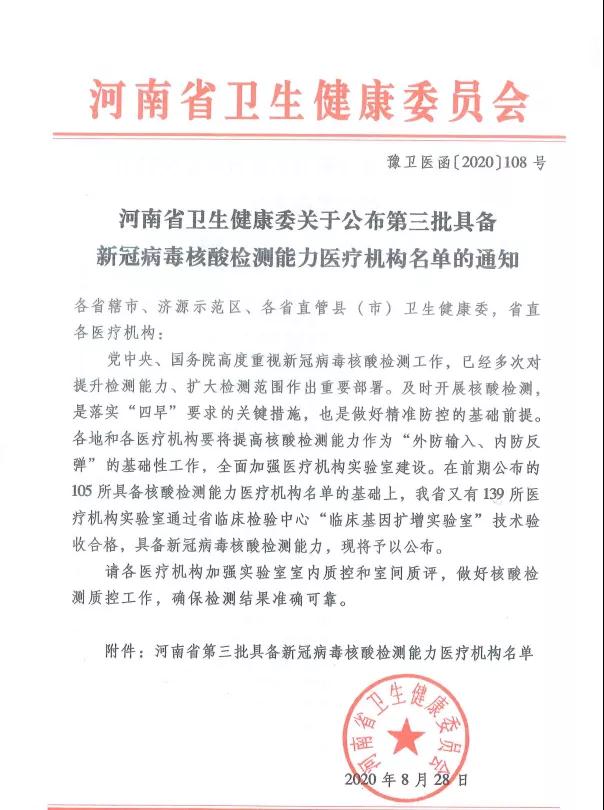 近日,鄲城縣婦幼保健院PCR核酸檢測實驗室通過了河南省臨床檢驗中心的室間質(zhì)量評價和實驗室二級生物安全備案,已具備新冠病毒核酸檢測能力,可承擔新冠病毒核酸檢測工作。目前,各高校正在陸續(xù)開學,但新冠疫情仍未完全控制,按照疫情防控要求,報到學生需進行一次核酸檢測,持報告單入學報到。鄲城縣婦幼保健院作為河南省衛(wèi)生健康委員會批準的新冠核酸檢測機構,積極承擔社會責任,按照“應檢盡檢,愿檢盡檢”的原則,已經(jīng)于2020年9月1日起正式開展新冠病毒核酸檢測工作,希望廣大學子及有檢測需要的人員,本著對自己負責、對家庭負責、對社會負責的原則,積極檢測,為疫情防控工作貢獻力量。