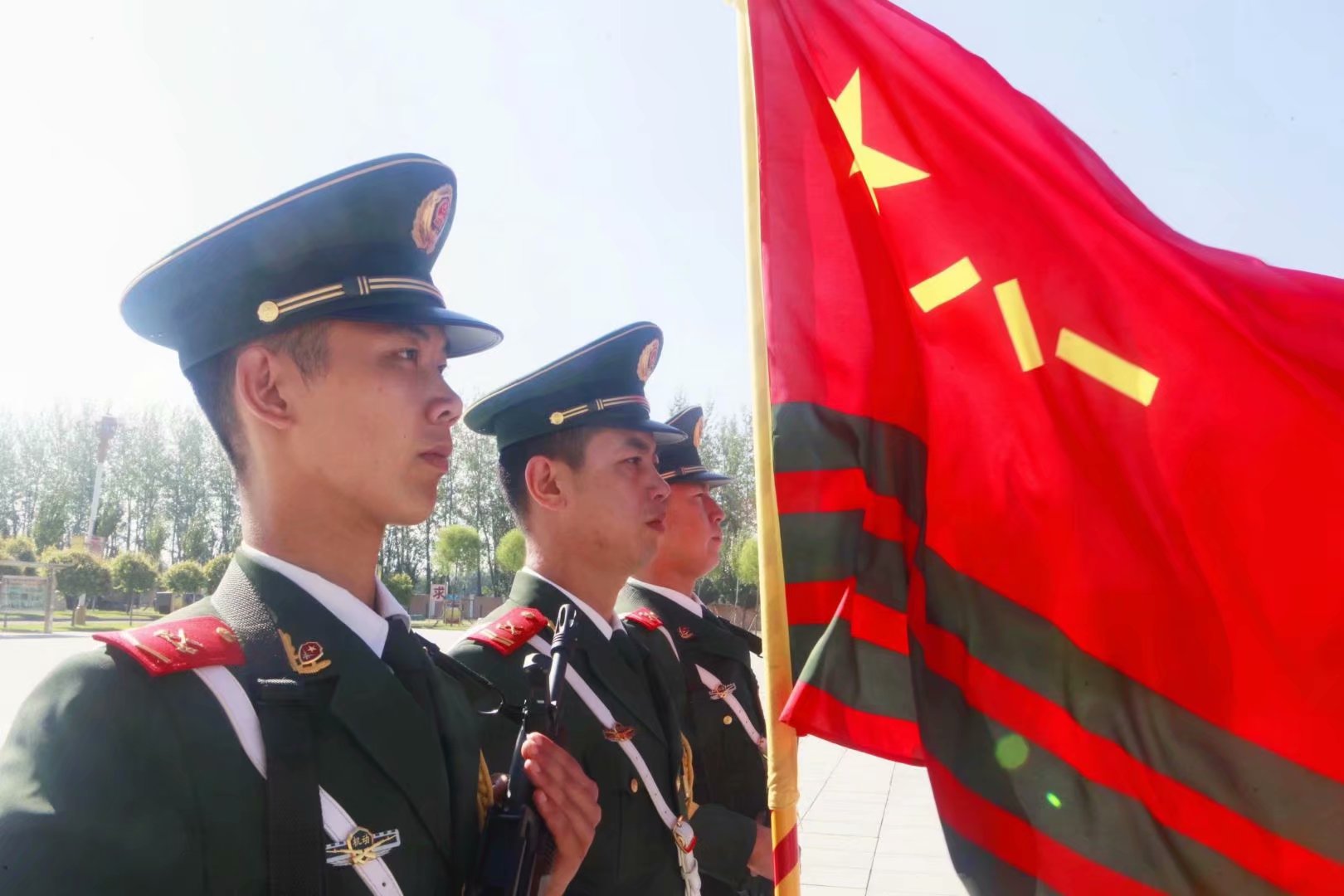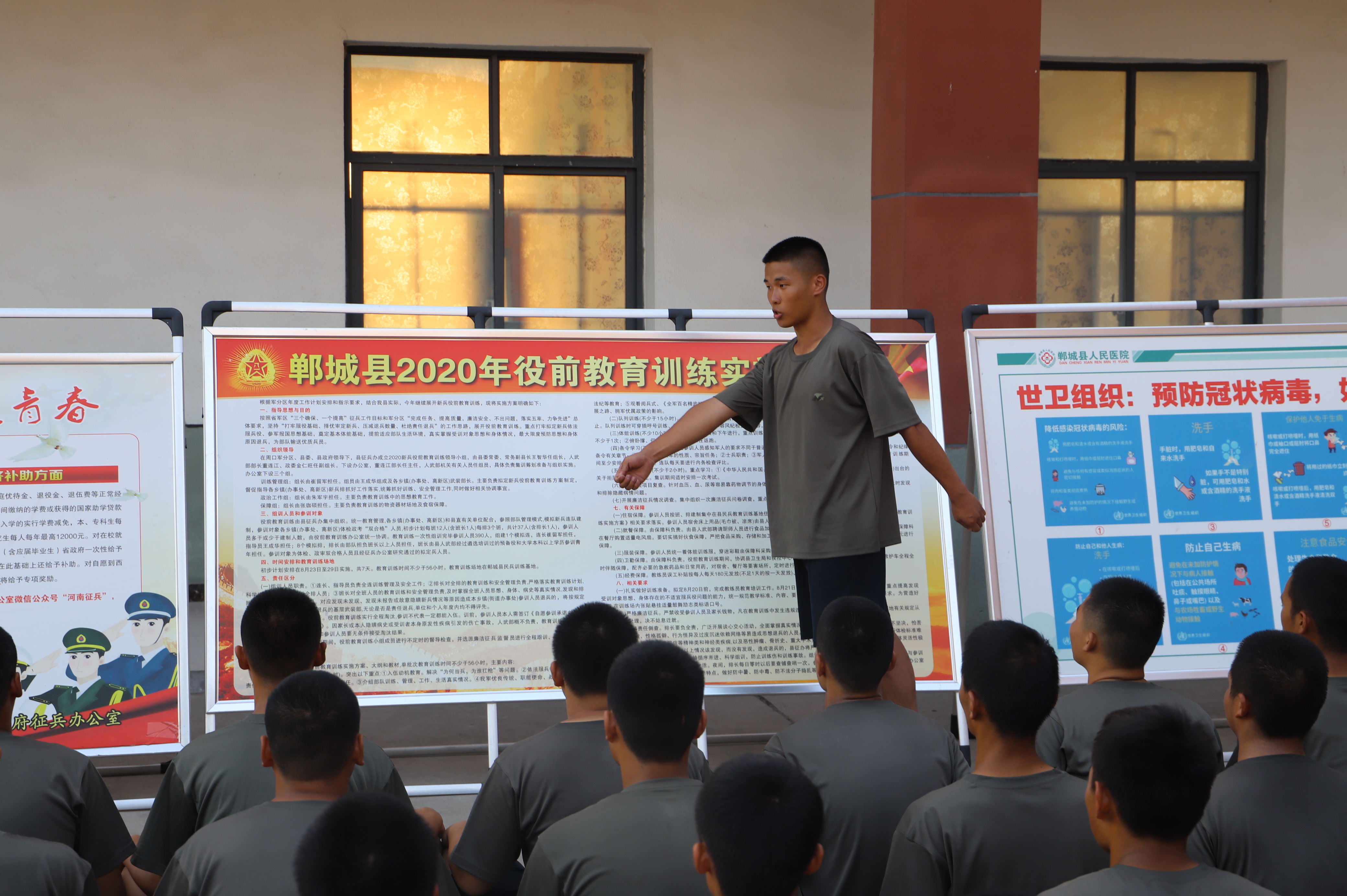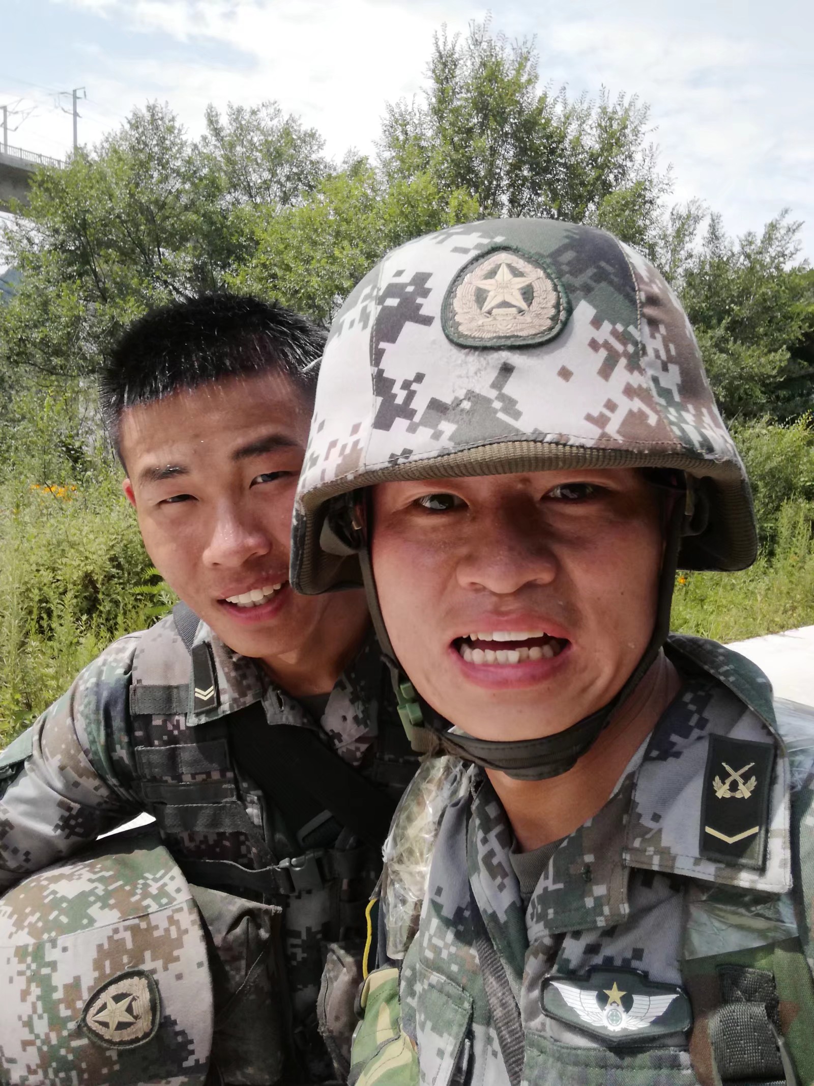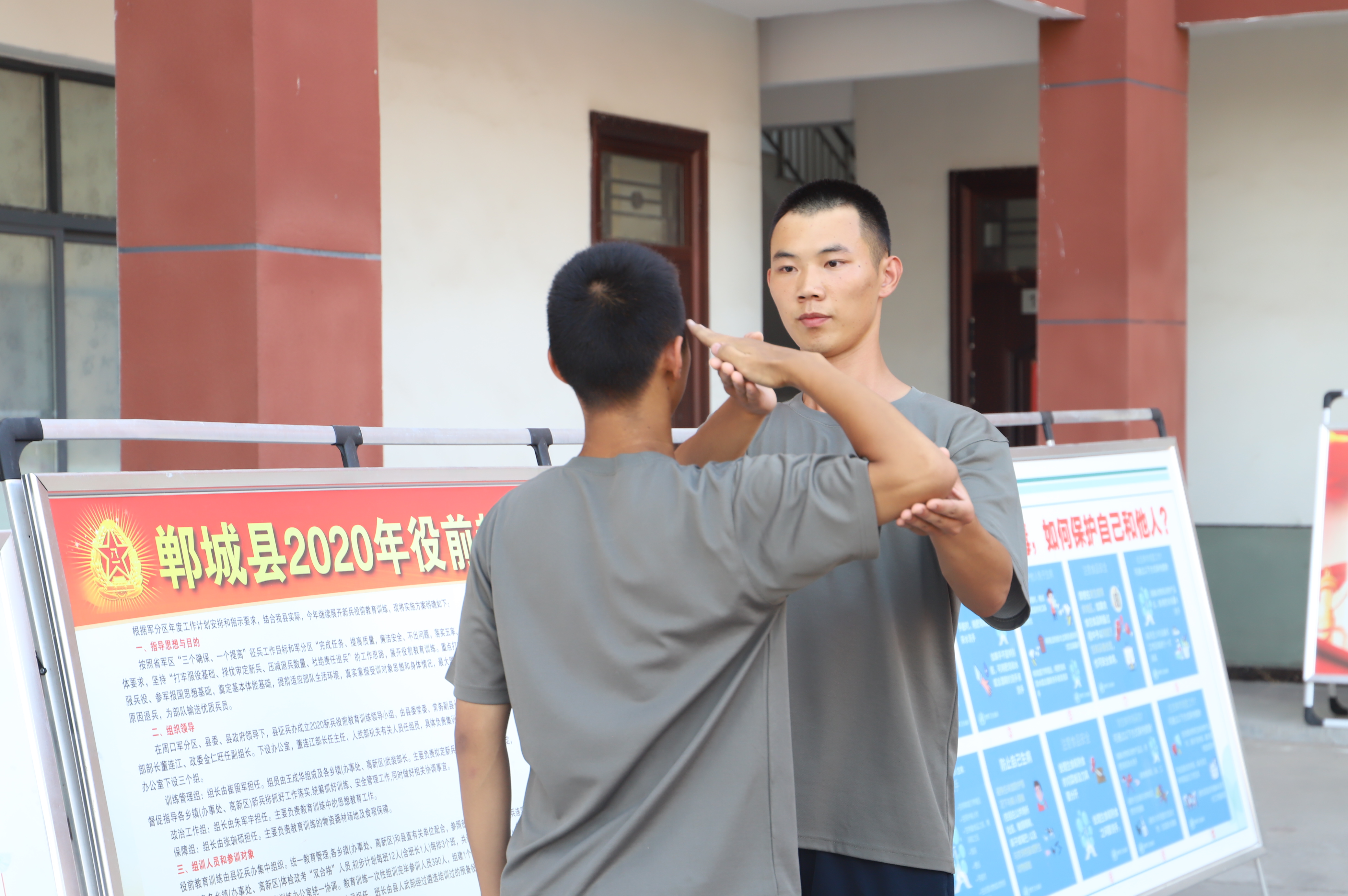 蛙跳、鴨子步、俯臥撐、側(cè)身敬禮、蹲起……盡管汗流浹背,兩位“老兵”在新兵面前沒有一絲疲倦,充分展現(xiàn)了軍人的風(fēng)采,也流露出了兩位青年向往軍營的堅(jiān)定意志。