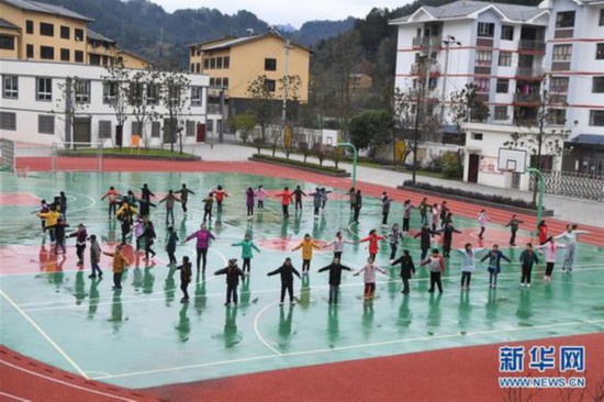 重慶市石柱土家族自治縣中益鄉(xiāng)小學的同學們在老師的帶領下練習擺手舞(2020年1月10日攝)。 新華社記者 王全超 攝