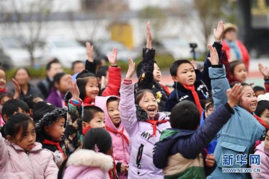 重慶市石柱土家族自治縣中益鄉(xiāng)小學的同學們在文藝演出現(xiàn)場與演員互動。當日,“我的中國夢——文化進萬家”中國視協(xié)文藝志愿服務小分隊走進中益鄉(xiāng)小學,為師生們帶來精彩的文藝表演(2019年12月12日攝)。新華社記者王全超 攝