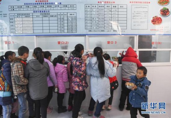 重慶市石柱土家族自治縣中益鄉(xiāng)小學學生在食堂排隊打飯菜(2020年1月10日攝)。 新華社記者 王全超 攝