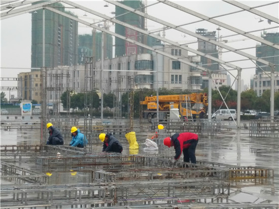 為迎接11月28日至30日舉辦的周商產品展示展覽活動,現(xiàn)場70余名施工人員不顧天氣惡劣,抓緊搶干工期,爭取在11月25日全面搭建完畢。