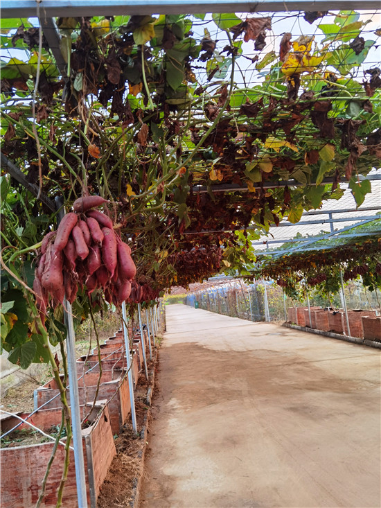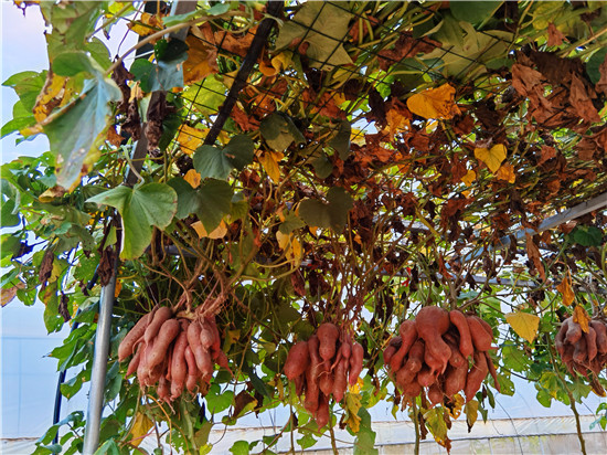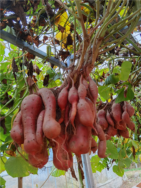 西華縣農(nóng)科所積極開展“空中結(jié)薯”試驗(yàn)種植研究,并取得成功?!翱罩薪Y(jié)薯”采取嫁接技術(shù),選用旋花科植物牽牛作砧木,脫毒薯苗作接穗嫁接而成,嫁接成活后栽到土壤里,搭建棚子,加強(qiáng)薯苗水肥管理,每株插一根小竹木桿,促進(jìn)薯苗快速生長(zhǎng)上棚,在棚上吊花盆,盆內(nèi)放蛭石,生長(zhǎng)到掤上的薯秧壓到花盆里,加強(qiáng)水肥管理。90天結(jié)薯,進(jìn)入10月份把花盆去掉。該技術(shù)打破傳統(tǒng)栽培方式,主要為公園、科技園區(qū)、農(nóng)業(yè)生態(tài)觀光園、家庭庭院內(nèi)培植,有很好的科研價(jià)值、觀賞價(jià)值和農(nóng)業(yè)推廣價(jià)值。周口日?qǐng)?bào)·周道客戶端記者李鳳霞 攝