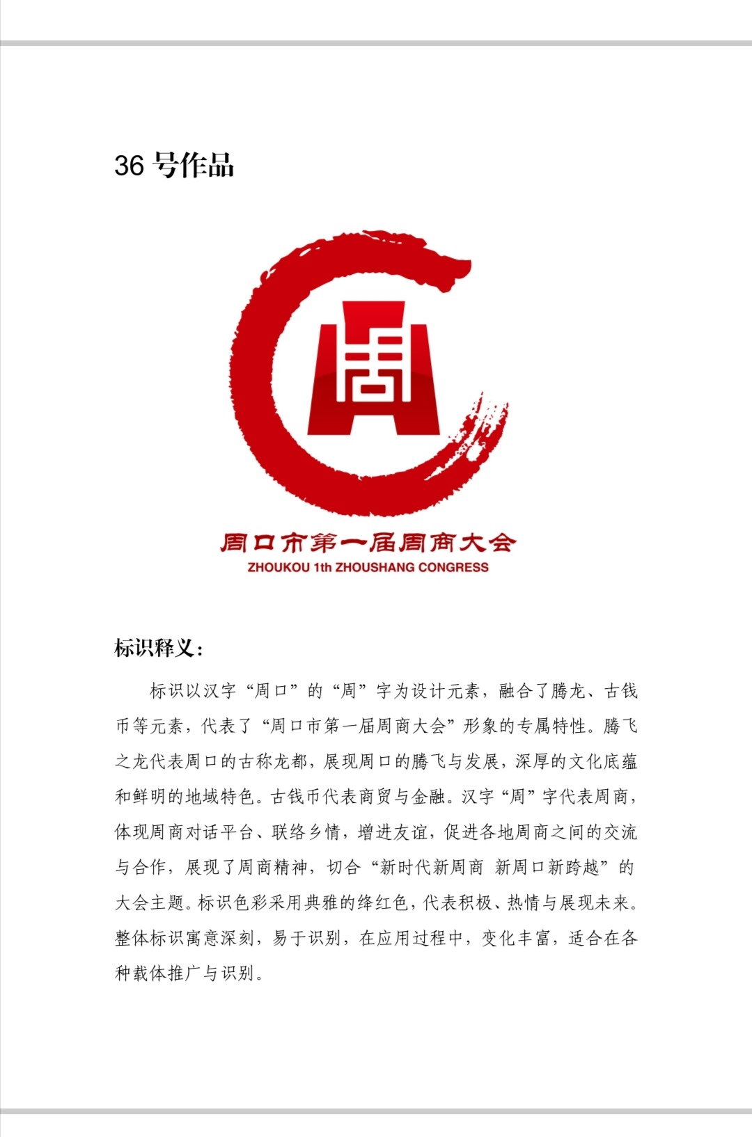 自11月12日起面向社會(huì)公開征集第一屆周商大會(huì)主題會(huì)標(biāo),截至11月19日24:00時(shí),大會(huì)工作組共征集到來自10個(gè)省轄市的作品67件。11月20日上午10:00時(shí),對(duì)作品進(jìn)行統(tǒng)一編號(hào)后,經(jīng)專家評(píng)審團(tuán)評(píng)審出55幅進(jìn)入評(píng)選,經(jīng)逐項(xiàng)打分初評(píng)出6件作品,最后按綜合得分前三名作品入圍。
