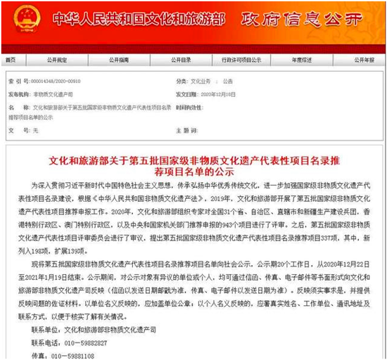 據(jù)了解,2019年,文化和旅游部開展了第五批國家級非物質文化遺產代表性項目推薦申報工作。2020年,文化和旅游部組織專家對全國31個省、自治區(qū)、直轄市和新疆生產建設兵團,香港特別行政區(qū)、澳門特別行政區(qū),以及中央和國家機關部門推薦申報的943個項目進行了評審。之后,第五批國家級非物質文化遺產代表性項目評審委員會進行了審議,提出第五批國家級非物質文化遺產代表性項目名錄推薦項目337項,其中,新列入198項,擴展139項。