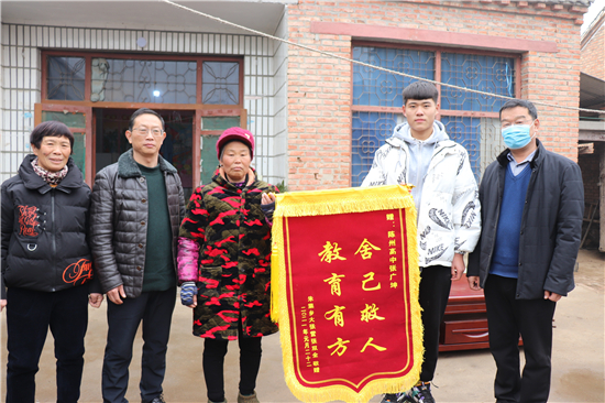得知張廣坤所在學(xué)校的領(lǐng)導(dǎo)和老師要來(lái)村子,被救4歲男孩張子豪的奶奶帶著事先制作的錦旗來(lái)到張廣坤家說(shuō),原本打算把錦旗送到學(xué)校,感謝陳州高中培養(yǎng)出廣坤這樣的好學(xué)生,是廣坤救了他們?nèi)?。她說(shuō),事發(fā)當(dāng)天下午5時(shí),她在家做晚飯,一不留神,4歲的孫子獨(dú)自抱住球出門(mén)跑到村坑塘邊的空地上玩耍去了。玩耍中,孩子不慎將球踢進(jìn)了水塘。“4歲的孩子能懂啥,光想著撈他的皮球,水至脖頸,害怕了哭喊起來(lái)。當(dāng)日,附近沒(méi)有人,孩子身上又穿著襖,要不是被廣坤及時(shí)發(fā)現(xiàn),俺家的日子以后真沒(méi)法過(guò)?!敝v到這,男孩的奶奶直掉眼淚。