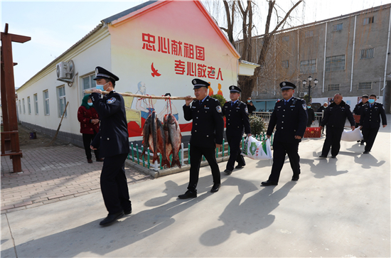 隨著春節(jié)日益臨近,該派出所所長(zhǎng)楊杰和大家商議,“送溫暖送祝福”活動(dòng),應(yīng)該先從尊老愛幼開始。于是,民警們購(gòu)買了60斤魚、100斤雞蛋和2袋面粉,利用中午休息時(shí)間來到敬老院,給老人們送上新春祝福。