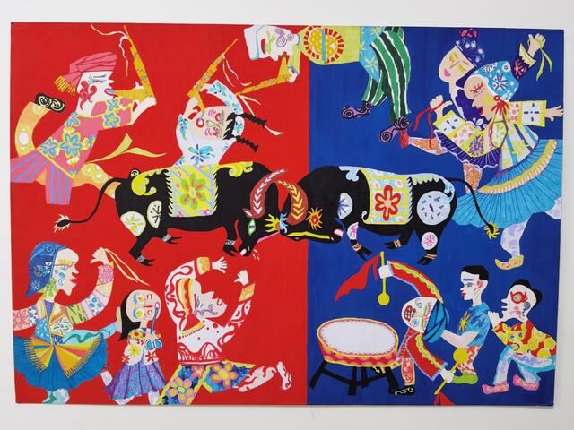 2020年4月,錢玉燕無意中看到“決勝全面小康”第二屆全國農(nóng)民畫展覽征稿啟事,對農(nóng)村生活非常熟悉的她決定一試。她立足于周口平原農(nóng)區(qū)的特色,深深領(lǐng)悟周口幾千年來的農(nóng)耕文化,對參賽作品進(jìn)行了認(rèn)真、系統(tǒng)地構(gòu)思,最終決定以歡慶豐收的斗牛活動(dòng)為題材,把農(nóng)耕文化的深遠(yuǎn)、厚重與豐富的藝術(shù)表現(xiàn)手法相融合。她采用普通的繪畫卡紙,運(yùn)用多種繪畫顏料,充分借鑒漢畫藝術(shù),吸收中原地區(qū)的剪紙文化、西方藝術(shù)大師畢加索立體畫派的藝術(shù)風(fēng)格和古埃及畫的靈感,以艷麗的紅、藍(lán)為主背景,采取夸張的表現(xiàn)手法,把斗牛的場景表現(xiàn)得淋漓盡致。作品創(chuàng)作發(fā)揮了豐富的想象力,人物動(dòng)物造型借鑒中國民間藝術(shù)剪紙的方式表現(xiàn),以大膽、夸張、強(qiáng)烈的色彩搭配,把無限深廣的空間“壓扁”到一個(gè)平面上。