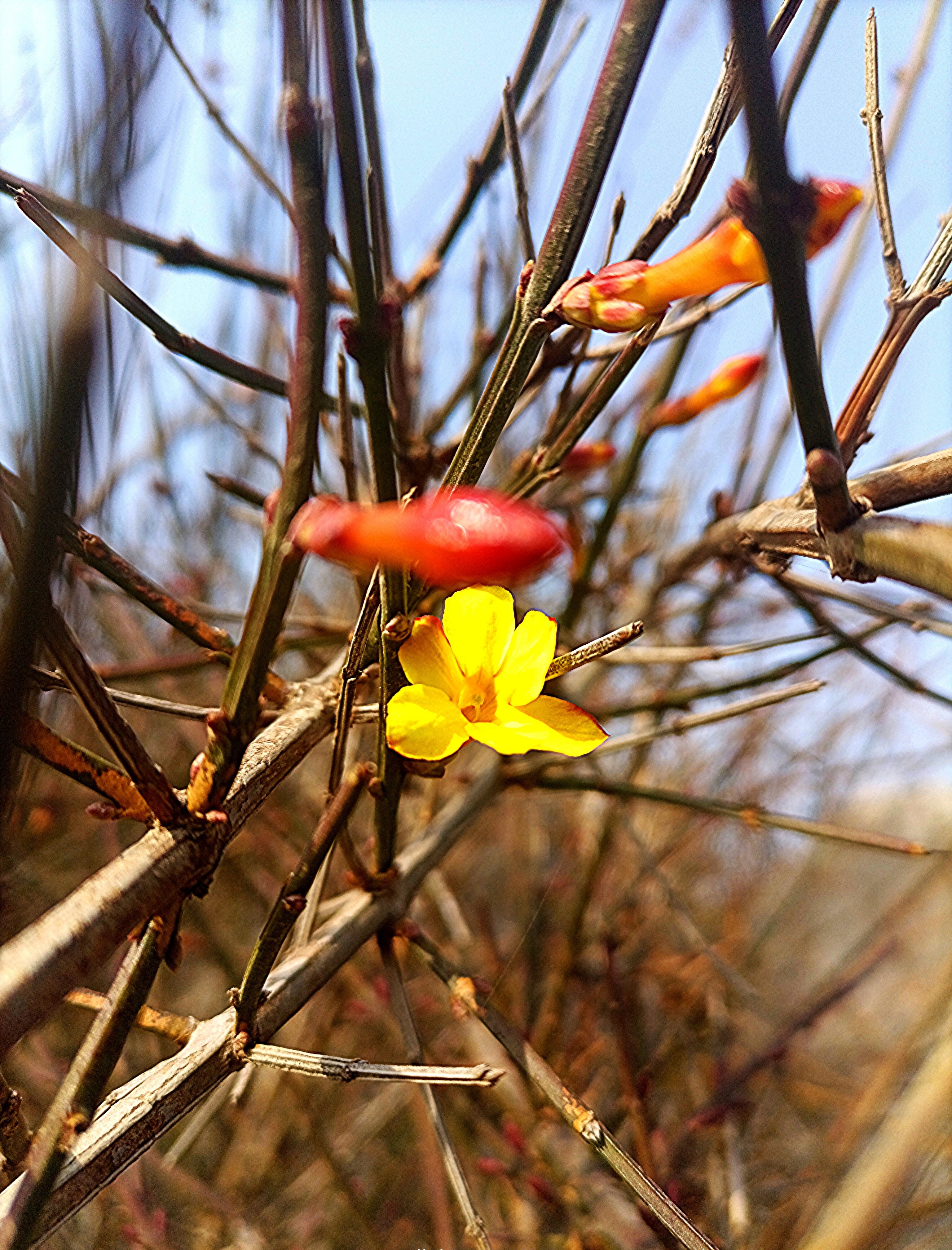 2月3日,是立春時(shí)節(jié)。接連幾日,我市天氣晴朗,氣溫漸暖,周口公園的迎春花枝條已經(jīng)掛滿了花蕾,偶有幾朵“性急”的花兒已經(jīng)綻放,迫不及待地迎接春天的到來,嫩黃的花瓣在陽光的照射下,閃耀出金子般的光芒,令人見之心喜。