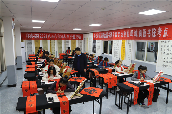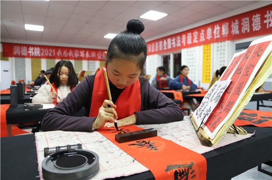 2月3日,記者在鄲城縣潤德書院看到,“我為我家寫春聯(lián)”活動正緊張地進行著,數(shù)十名書法小學員端坐案前、從容執(zhí)筆、揮毫作書,一個個福字工整又靈活,一副副對聯(lián)娟秀又詩意。孩子們在屋內(nèi)全神貫注地寫字,把最美好的祝福用自己的所學展示給家庭;家長們在窗外掂腳張望,望子成龍、望女成鳳的心態(tài)表露無遺。