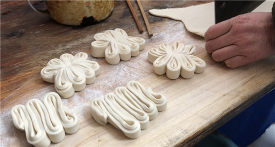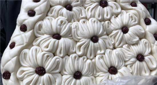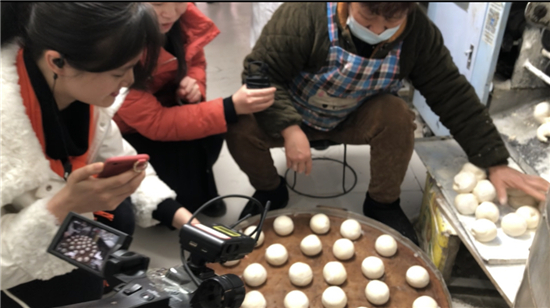 除了平常的白面饅頭,黃師傅還讓妻子現(xiàn)場(chǎng)展示了“棗山”制作,并介紹了棗山的寓意和習(xí)俗?!澳憧催@棗山是一層一層的,寓意著步步登高,而且棗山的花形是圓的,代表著團(tuán)團(tuán)圓圓。過去出嫁的閨女過年回娘家要帶大饃,娘家要回棗山,現(xiàn)在咱們周口的一些地方還保留著這樣的習(xí)俗。”兩位主播體驗(yàn)了棗山的制作過程,得到黃老板妻子的夸獎(jiǎng):“中!這倆妮兒可巧!”