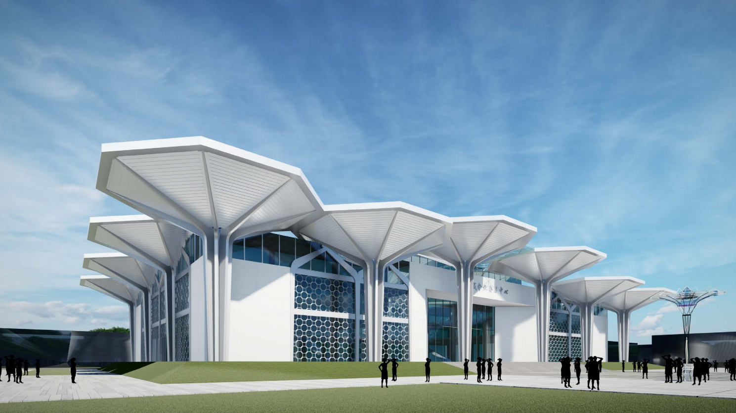 鄲城縣傘業(yè)產(chǎn)業(yè)園電子商務(wù)服務(wù)中心項目是鄲城縣傘業(yè)全產(chǎn)業(yè)鏈展銷的窗口項目、展示項目。會展中心的設(shè)計概念以“傘啟鄲興”為主題,基于對本土特色文化的深入解讀、同時結(jié)合“傘”的具體特征,提煉傘蓋、傘骨、傘柄的特殊形象為基本元素。建筑主立面以八個巨大傘形構(gòu)架依次展開,巨型的尺度、新穎的造型有極強(qiáng)的昭示性,裝飾幕墻八邊形的單元分割也隱喻了傘蓋的造型,創(chuàng)新的視覺形象為傘業(yè)產(chǎn)業(yè)園增加了新的注解。會展中心整體的建筑風(fēng)格充分展示了鄲城傘業(yè)產(chǎn)業(yè)園的核心價值,形成獨具特色的地標(biāo)形象。