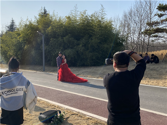 優(yōu)美的景色不是市民享受春光的好去處,也是拍攝婚紗照的好地方。“老婆靠老公近一點、再近一點,微笑、嗯不錯?!币粚π氯苏谂幕榧喺?,紅色的婚紗與自然的風景融在一起,盡顯新娘的美麗。在植物園里,拍一組森系風格的婚紗照很是漂亮,春風將“調色板”打翻,一對新人的甜蜜愛情就這樣被定格在這春天里。