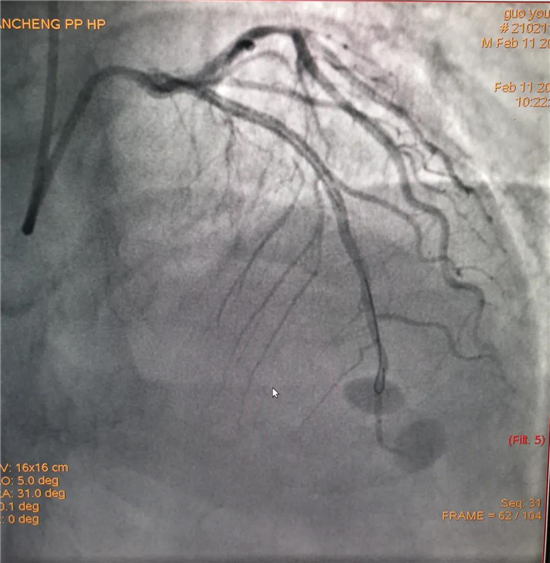 除夕,郭先生無(wú)明顯誘因突發(fā)胸痛,120急救人員到達(dá)現(xiàn)場(chǎng),心電圖顯示:竇性心律完全性束支傳導(dǎo)阻滯。信息立刻發(fā)送到胸痛中心介入微信群中,心內(nèi)科值班醫(yī)生初步診斷為急性廣泛前壁心肌梗死,必須盡快進(jìn)行急診支架治療,開(kāi)通血管。值班醫(yī)生電話(huà)指導(dǎo)院前治療,并立即啟動(dòng)胸痛綠色通道,24小時(shí)備班的介入治療團(tuán)隊(duì)立即到位,9:30患者被送到導(dǎo)管室行冠脈介入診療,9:40急診PCI手術(shù)隨之開(kāi)始,冠脈造影檢查提示左前降支閉塞,植入支架,堵塞的血管被順利打通,患者癥狀緩解,手術(shù)非常成功,10:20患者被送往病房進(jìn)一步治療。