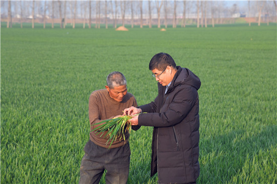 3月3日,商水縣黃寨鎮(zhèn)農(nóng)技人員在察看小麥長(zhǎng)勢(shì)。近日,我市普降小到中雨,旱情解除,土壤墑情改善,有利于冬小麥起身返青,為農(nóng)業(yè)豐收打下基礎(chǔ)。周口日?qǐng)?bào)·周道客戶端記者 付永奇 攝