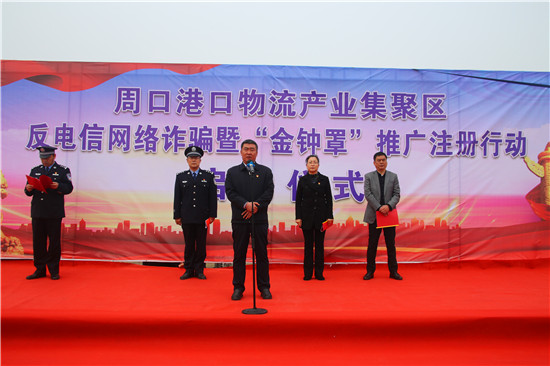 為打擊治理電信網(wǎng)絡(luò)詐騙犯罪,降低詐騙案件發(fā)生率,4月13日,周口港區(qū)舉辦反電信網(wǎng)絡(luò)詐騙宣傳暨“金鐘罩”推廣注冊(cè)行動(dòng)啟動(dòng)儀式,宣傳反電詐知識(shí),推廣公安部門(mén)推出的反詐騙系統(tǒng)平臺(tái)“金鐘罩”。港區(qū)黨委書(shū)記孫鵬到場(chǎng)宣布行動(dòng)正式啟動(dòng),港區(qū)黨委委員、紀(jì)委書(shū)記李素芹,公安分局局長(zhǎng)康群泉在儀式上講話。