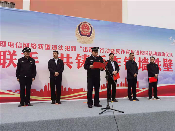 4月18日上午,鄲城縣打擊治理電信網(wǎng)絡(luò)新型違法犯罪“迅雷”行動(dòng)暨反詐宣傳進(jìn)校園活動(dòng)儀式在縣三高啟動(dòng)??h政府副縣長(zhǎng)、公安局長(zhǎng)陳鳳祥,縣政府辦公室主任賈培民,縣教體局黨組書(shū)記、局長(zhǎng)羅明黨等出席啟動(dòng)儀式,縣打擊治理電信網(wǎng)絡(luò)新型違法犯罪工作各成員單位、縣公安局、縣三高分別組成代表隊(duì)2200余人參加啟動(dòng)儀式,儀式由賈培民主持。
