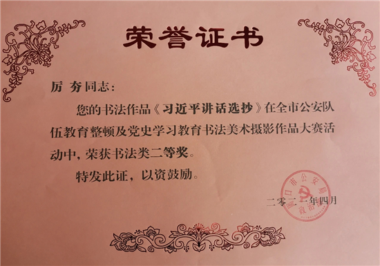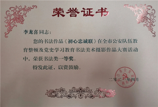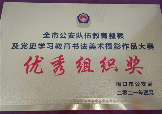 本次大賽,我市民輔警積極參加,踴躍報送,選送書法、美術、攝影作品30余件。其中扶溝縣公安局宣傳科李龍喜、交警大隊厲夯等人的書法《初心忠誠聯》《習近平講話選抄》等作品分別榮獲書法類一等獎、二等獎;扶溝縣公安局宣傳科閆曉鳳等人的攝影作品《晨讀》、《走訪話安全》等分別榮獲攝影類二等獎、三等獎。此次大賽,全面筑牢了民輔警忠誠履職的思想根基,切實把教育整頓及黨史學習教育活動的成果轉化為思想成果和工作成果。充分展示了扶溝公安堅定的理想信念和良好的精神風貌。②9