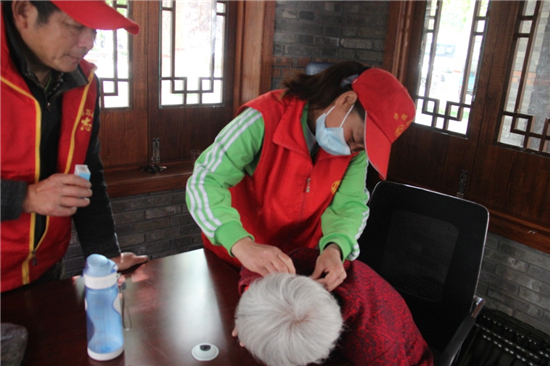 5月2日上午,在我市文明路與交通大道市民驛站,當(dāng)值的慈孝文化志愿者王大穩(wěn)正為一位老人滴注藥液。