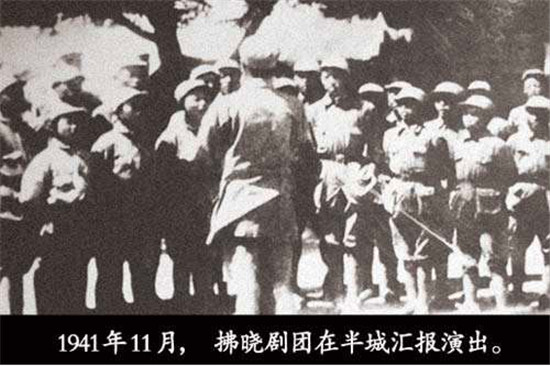 1938年深秋,劇團到泌陽縣鄧莊鋪演出,群眾自動地找木棍、找門板、挖土埋柱子,很快搭起一座戲臺,掛上幕布,點燃油燈,男女老少坐在戲臺前的空地上。戲臺上先是演員們合唱抗日歌曲《新四軍軍歌》《游擊隊歌》《到敵人后方去》等,后演出話劇《突擊》。當(dāng)劇中的老爺爺抱著被日寇殺死的孩子,含淚控訴敵人的暴行時,臺下的觀眾禁不住地憤怒高呼:“打倒日本帝國主義!把日本鬼子趕出中國!”1939年11月初,徐海東隨劉少奇由竹溝到華中路過新興集,彭雪楓命拂曉劇團組織一個晚會,以示熱烈歡迎。拂曉劇團接受任務(wù)后,大家爭分奪秒,只用了一天時間,就集體創(chuàng)作排練出京劇《徐海東粉碎日寇“掃蕩”》,第二天就在歡迎晚會上演出。