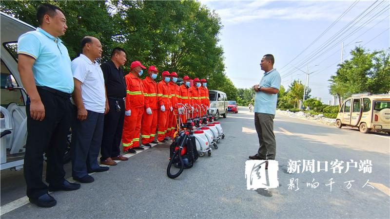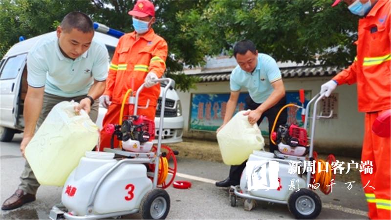 “老關(guān),你們?nèi)膫€人去女媧景區(qū)消殺。老王,老溫你們兩個人去村莊消殺,尤其是旮旯處、垃圾堆、屋后等隱蔽重點區(qū)域一定消殺徹底,不留空白。在村莊內(nèi)進行消殺時,一定要和群眾交代好防疫消毒時的注意事項。”7月30日9時許,來自廣州市鴻鷹害蟲防治服務(wù)有限公司周口分公司的10多名愛心人士載著4臺機動手推式滯留噴霧機、1臺電動背負(fù)式超低容量噴霧機、1臺大型車載式超低容量噴霧機和230公斤消毒劑,來到西華聶堆鎮(zhèn)思都崗村后,該公司負(fù)責(zé)人許金山就向工作人員一一分配消殺任務(wù)。