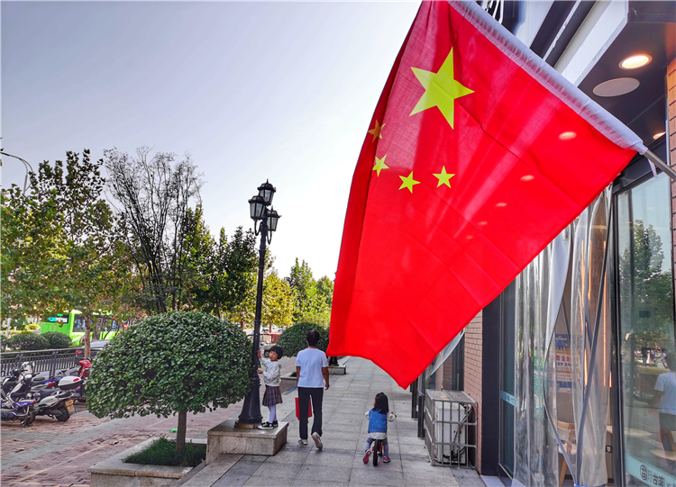 9月30日,市區(qū)臨街商鋪門前五星紅旗隨處可見,紅旗隨風(fēng)飄揚(yáng),將街道裝扮一新,喜迎國(guó)慶節(jié)的到來