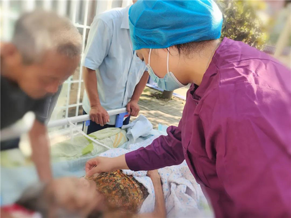 接到派單后,心血管二病區(qū)護士長孫娜第一時間與患者家屬取得聯(lián)系,得知這位近百歲的老人是在凌晨一點多自行把胃管拔了出來,早晨還沒有進食,于是帶著護士陳珍珍第一時間趕往了患者家里。還未下車,她們就看到患者家屬在門口著急地張望:“怎么這么快,太好了,我的老母親不用餓肚子了?!?/p>