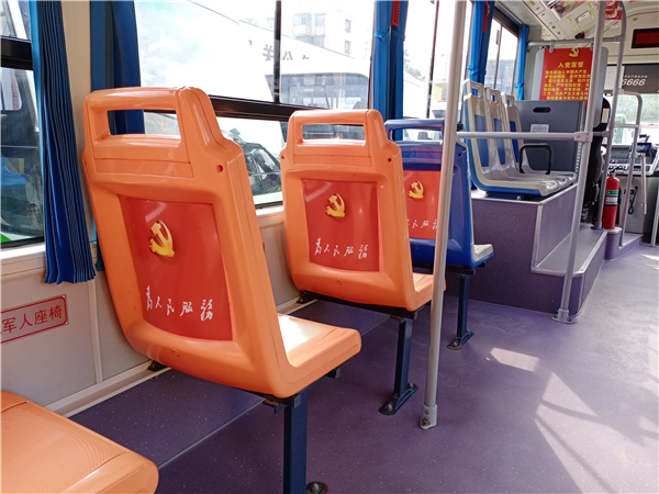 圖片說明:10月25日,記者在周口市公交總公司院內看到,一輛車頭前印有“紅色主題班線”標識的公交車格外引人注目,雖然該車的外形與其他車差別不大,可是車廂內貼滿了紅色標語口號,給人耳目一新的感覺。記者看到,車廂內的扶手、座椅及車頂上都貼有“為人民服務”“學黨史、悟思想、辦實事、開新局”“革命小故事”等宣傳內容。③2